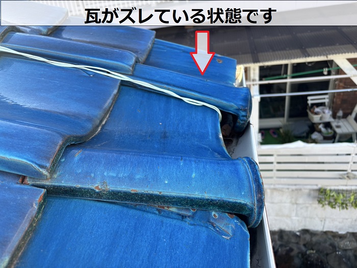 この様なご相談を神戸市長田区にお住まいの方より頂きました。現地調査へお伺いして既存の屋根の状態を確認したところ、棟瓦のズレや瓦本体のズレを確認。